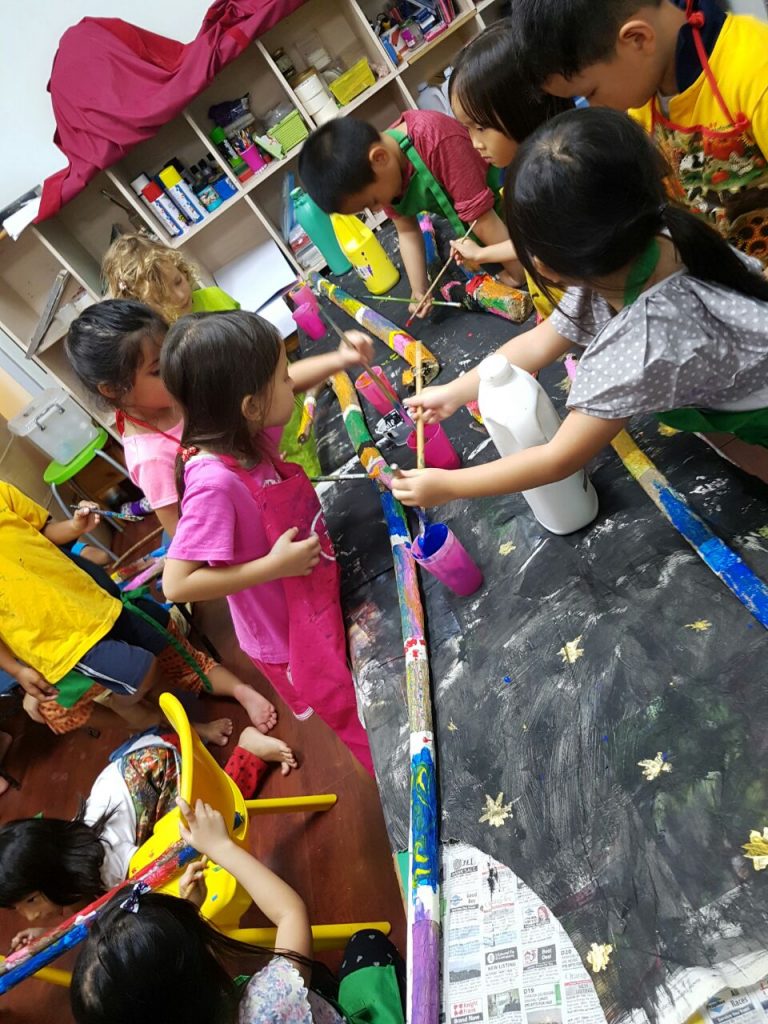 At least one to two months before the date of the exhibition, the teachers will sit with the children and start brainstorming ideas based on the theme that has been chosen. The children will share their ideas and thoughts on the theme and think about different topics that they can explore about based on the theme given. From there, a specific topic will be chosen for each classroom for them to be inspired from and create their art pieces. The children and teachers will then work hard to create art pieces using a variety of medium such as 2D art using paint and collage or 3D construction using mainly recycled materials. They will slowly transform the school similar an art gallery like the Singapore Art Museum or Imaginarium. These art installations not only portray the children’s talents and hard work but most importantly centralises around given a space for children’s voices to be heard, their thoughts and ideas to be the centre of the installations.