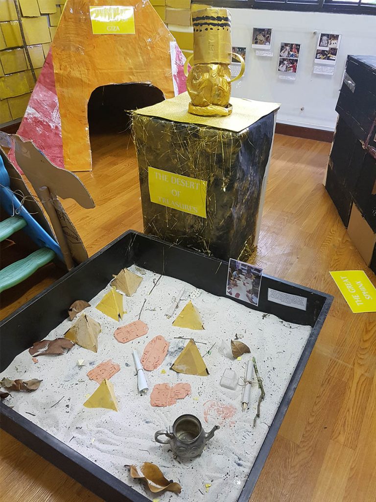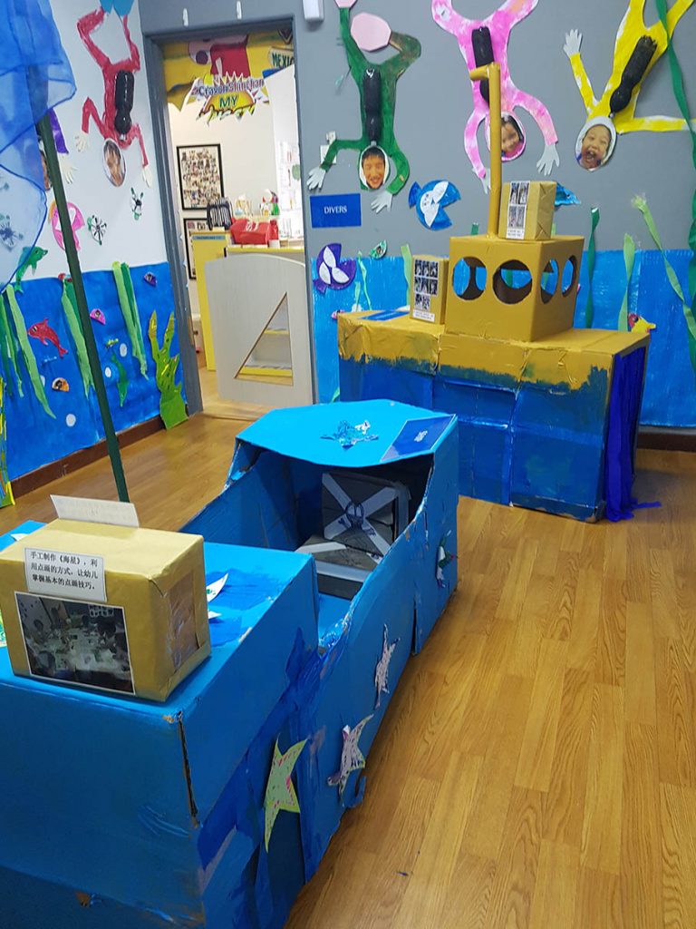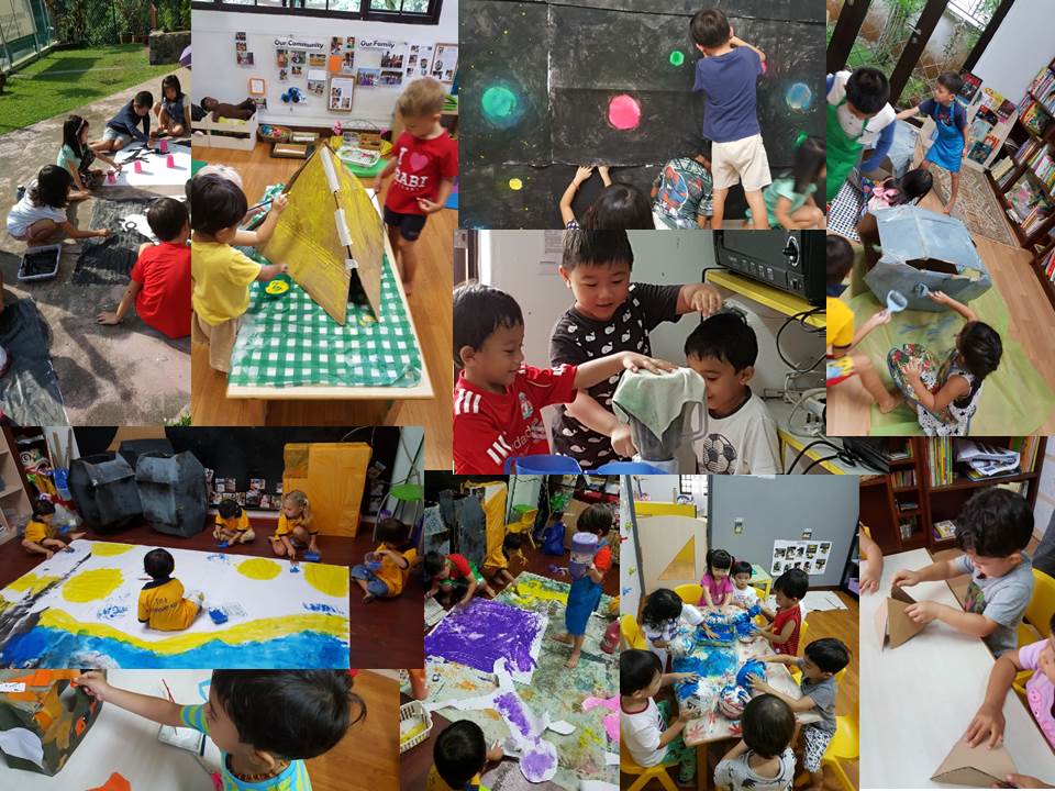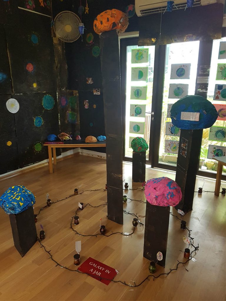 Big art installations created from cardboards and recycled papers include the Millenium Falcon, rocketship, submarine, a tree and sphinx where some of the central 3D art installations in each class. Then, the teachers also allowed each child to express their own individual flare through paintings of colourful trees, making their own fish, forming their versions of the pyramids and creating stories about the outerspace for the older children. Each class had their own story and reasons behind each art installations and these were documented throughout either through photographs, captions or the art pieces itself.